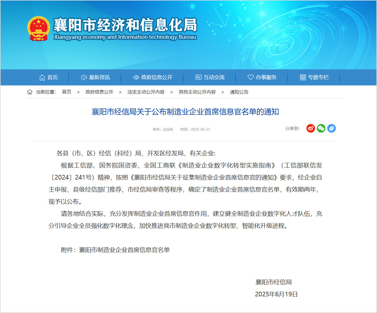 近日,襄陽市經(jīng)信局發(fā)布《襄陽市經(jīng)信局關于公布制造業(yè)企業(yè)首席信息官···